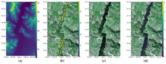 Intermediate calculation results in Ushmun: DEM (in meters) (a), ALWS (in meters) (b), flood edge (c), estimated water depth (in meters) (d).