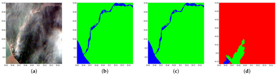 Test area (DF): Krasnodar Krai, Russian Federation. Observation date: 6 July 2021. RGB composite (a), manual markup (b), models (MS + SAR and SAR) prediction (c), model (MS) prediction (d). Legend: water, background, clouds.