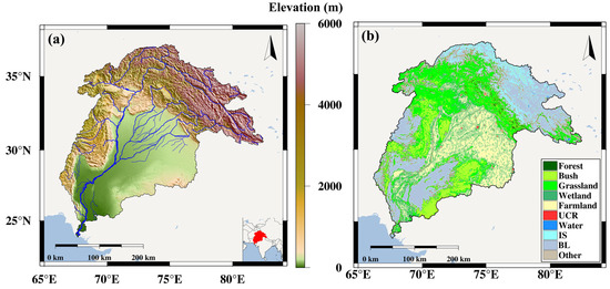 The topographic (a) and land cover type (b) map of IRB. UCR: Urban and Construction region; IS: Ice and Snow; BL: Bare Land.