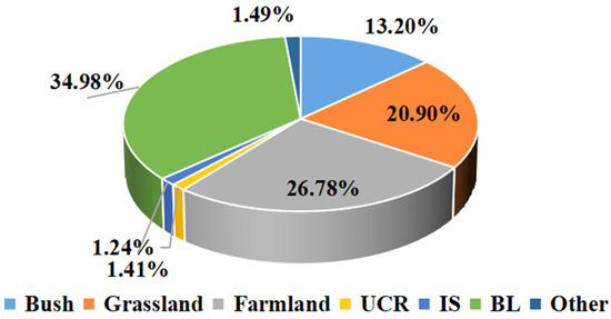 The land cover type gridded data were provided by the MODIS land vegetation cover classification product’s sixth edition. The product with a spatial solution of 500 × 500 m was estimated via the observations obtained from Terra and Aqua, which contain the main land cover types in the world at present [38,39]. Figure 2 shows the proportion of area occupied by each land cover type in the IRB.