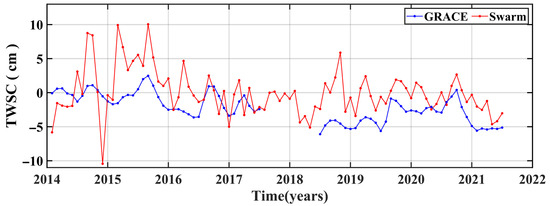 The temporal evolution of GRACE and Swarm TWSC results in the IRB from 2014 to 2021.
