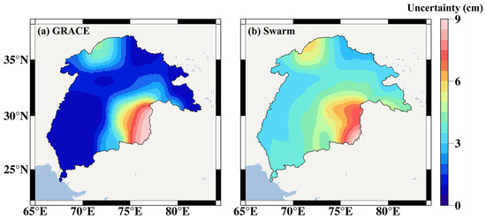 In Figure 3, the TWSC time series has a disruption (from July 2017 to May 2018) due to the lack of a tight interface between GRACE and GRACE-FO missions. The GRACE satellites stopped working in July 2017, while the GRACE-FO satellites were launched in April 2018 and started working in the next month. To fill this gap, we used the Swarm TWSC result in our study. As the Swarm mission period extends from January 2014, we compared the GRACE and Swarm TWSC results derived during 2014 and 2021. Figure 4 and Table 1 show that Swarm TWSC has similar peaks, troughs and change trends to those of GRACE TWSC. However, the fluctuation range of Swarm TWSC is significantly greater than that of GRACE due to the greater uncertainty of Swarm TWSC [23]. Figure 5 shows that the uncertainties of GRACE and Swarm TWSC have the same spatial distribution. In most regions, the uncertainties of GRACE TWSC are lower than 2 cm, while those of the Swarm TWSC are mainly concentrated between 3 and 6 cm.