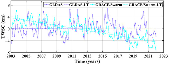 In Figure 6, we used GRACE and Swarm TWSC to construct 19 consecutive years of TWSC time series (GRACE/Swarm TWSC) in the IRB, using data derived between 2003 and 2021. To evaluate the reliability of the combined TWSC result, we compared the GRACE/Swarm and GLDAS TWSC. The results show that the two TWSC results have the similar peaks, troughs and change trends. However, GLDAS TWSC result (−0.12 ± 0.61 mm/a) shows a smaller decreasing rate than that of GRACE/Swarm (−4.32 ± 0.41 mm/a). This result occurs because the GLDAS TWSC result only reflects the naturally induced TWSC, while the GRACE/Swarm result is the sum of the naturally and human-induced TWSC. Previous studies [49,50] show declining TWSC in the IRB due to the high water withdrawals required for agricultural irrigation.
