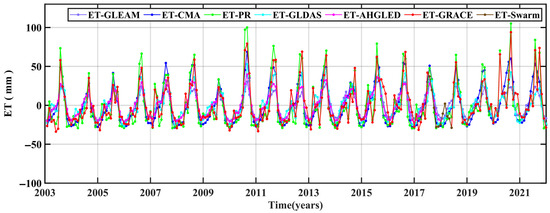 The temporal evolution of ET-GRACE and other five ET products in the IRB between 2003 and 2021.