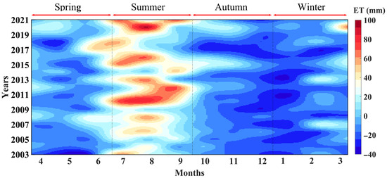 Seasonal characteristics of monthly ET-GRACE in the IRB from 2003 to 2021.