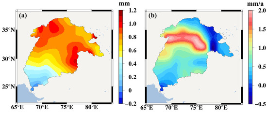ET-GRACE/Swarm exhibits a significant seasonal variation characteristic (Figure 9). The red regions (high ET) are mainly concentrated in summer, while the blue regions (low ET) are mainly concentrated in autumn. This result means that the peak and trough of ET appear in summer and autumn. The maximum ETs (100 mm) appeared in summer of 2020, and the minimum ETs (−40 mm) occurred in autumn of 2012 and 2014. Figure 10a shows that the annual average ET in the IRB is 0.5 mm, and the variation range is −0.2~1.2 mm. The spatial distribution shows a gradually decreasing distribution trend in a northwest–southwest direction. Long-term trend changes in ET (Figure 10b) show increasing trends (0.7 mm/a) across most of the IRB, but there is a downward trend in parts of the northeastern area. The largest increasing rate (1.5–2.0 mm/a) occurs in the north–central region.