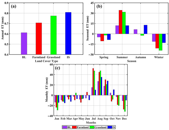 To further discuss the discrepancy between ETs in the different land cover types, we show the performance of ETs on three time scales (Figure 12). In Figure 12a, the largest annual ET appears in the IS (0.81 mm), followed by grassland (0.78 mm), farmland (0.71 mm) and BL (0.62 mm) regions. This result is not consistent with the area percentage of the four land cover types. It shows that the size of ET is independent of the area of the land cover type. Figure 12b shows the seasonal distributions of ET in the four land cover types. Except for IS, the ETs reach the maximum (farmland, 38.2 mm; grassland, 35.7 mm and BL, 12.4 mm) in summer, while the maximum ET (13.2 mm) in the IS appears in Autumn All the minimum ETs occur in winter. In summer, all the ETs are positive, and only the ET in the IS and BL are postive in autumn. Positive ET concentrates in summer, which is due to the greatest PPT occurring in this season. In Figure 12c, the largest ETs appear in July (farmland and grassland regions) and August (BL and IS regions), respectively, while the smallest ETs occur in December (farmland and grassland regions), July (BL region) and February (IS region). From the absolute value of ET changes, the fluctuations in grassland and farmland regions are the largest. Overall, the farmland and grassland regions have the largest ET changes, and the IS region has a different temporal distribution of ET with other three land cover types.