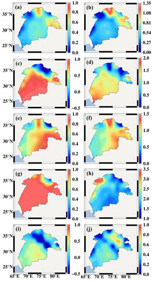 The spatial distributions of correlation coefficient and VIP between ET and ST, TCWS, SH, PPT and WS: (a) correlation coefficient between ET and ST; (b) VIP between ET and ST; (c) correlation coefficient between ET and TCWS; (d) VIP between ET and IS; (e) correlation coefficient between ET and SH; (f) VIP between ET and SH; (g) correlation coefficient between ET and PPT; (h) VIP between ET and PPT; (i) correlation coefficient between ET and WS; (j) VIP between ET and WS.