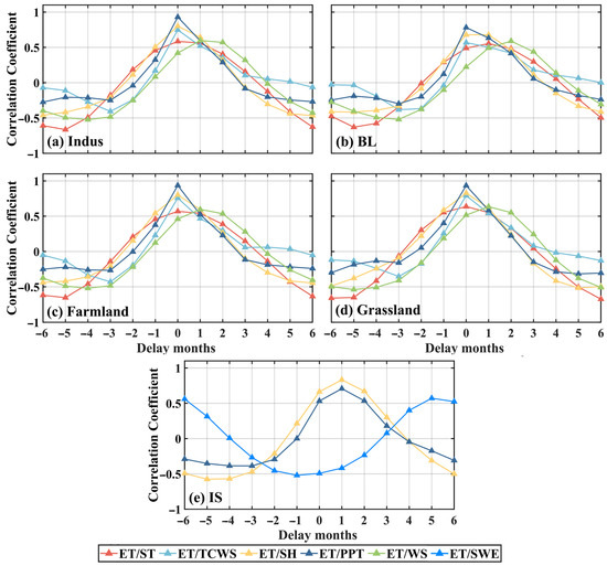 As there is a delay in the interactions between the hydrometeorological factors, we calculated the maximum correlation coefficients and delay months between ET and six hydrometeorological factors in the IRB and areas with different land cover types (Figure 14). In Figure 14a, ET has a strong correlation with ST, TCWS, SH, PPT and WS in the IRB (all correlation coefficients are greater than 0.57). Among these factors, the correlation coefficient between ST and ET is the smallest (0.57). The response times of ET to ST, TCWS, SH and PPT are 0 months, but the response time of ET to WS is 1 month. This finding is due to the indirect impact of WS on ET [55]. Comparing Figure 14a–d, the relationships between ET and ST, TCWS, SH, PPT and WS in the grassland, farmland and BL regions are the most similar to those in the IRB, that is, the correlation order of five hydrometeorological factors is the most consistent. Among three land cover types, the correlations between ET and ST, SH, PPT and WS are the largest in the farmland region, while that between ET and TCWS is the largest in the grassland region. This finding indicates that ET in the farmland region is more vulnerable to climate change, and vegetation transpiration activity in the grassland region is more active than that in the farmland region. Figure 14e shows that the impact of PPT on ET is weaken (correlation coefficient from 0.97 to 0.70), which is smaller than the one of SH. The response time of ET to SH and PPT increase (from 0 month to 1 month). And SWE has a significant correlation with ET (correlation coefficient is −0.52). This finding demonstrates that the proportion of moisture provided by SWE to ET is increasing, while that provided by PPT to ET is decreasing. However, the moisture provided by PPT is relatively large. In the IS, the process of ET is stretched, which may be due to the low temperature and dry environment.