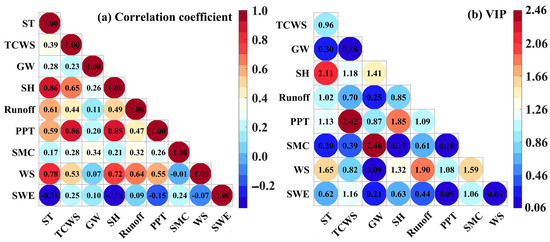 To further understand the role played by ET in the land–atmosphere water cycle, we calculated the correlation coefficients and VIPs between nine hydrometeorological factors (Figure 15). TCWS has a stronger correlation with PPT than runoff and SMC, which shows that vegetation absorbs most of water brought by PPT. This result is consistent with the conclusion that TCWS is the terrestrial water component most strongly correlated with ET (Table 3). Comparing Table 3 and Figure 15, the correlations between runoff, SMC and PPT are the similar to that of ET. This result shows that the proportion of water distribution brought by PPT is consistent with that returned to the atmosphere by the terrestrial water. It preliminarily reveals the pattern of water exchange between the land and the atmosphere. ST has a strong correlation with WS because the two factors represent the reflection of energy.