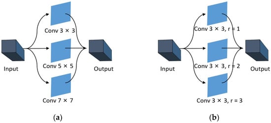 In general, CNNs utilize fixed-size convolution kernels to extract features with fixed receptive fields [36,39]. However, multi-scale convolution can extend the range of receptive fields by utilizing multiple convolution kernels of varying sizes, thereby facilitating the more effective extraction of both global and detailed features. As illustrated in Figure 1a, three distinct sizes of convolution kernels with sizes , , and are used as illustrative examples. The feature information of three different receptive fields can be acquired through convolution kernels with varying sizes, and more comprehensive features can be obtained via feature fusion compared to fixed convolution kernels. However, as the size of the convolution kernel increases, so does the number of parameters involved in the computation. To reduce parameter calculation, dilated convolution is introduced in this paper. As illustrated in Figure 1b, a small-sized convolution kernel with dilated rate and is used to replace the large-sized and convolution kernel, respectively.