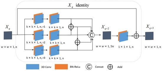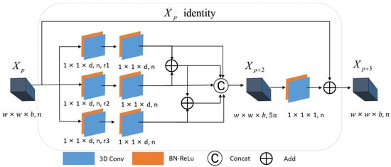 In the spatial residual block, a three-layer convolution structure is employed for spatial feature extraction, as illustrated in Figure 4. Similar to the multi-scale spectral residual block, a double-layer convolution structure with three independent branches is also used between layer and layer . Among them, the three branches between layer and layer utilize dilated convolution kernels with varying dilation rates of size to extract spatial information at multiple scales. The resulting features from these three branches are: