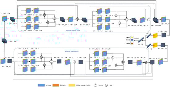 The proposed DBMSRN framework in this study consists of two parallel branches, namely the spectral multi-scale residual branch and the spatial multi-scale residual branch. Spectral and spatial features are extracted separately before being fused for classification. It is because the separate extraction of spectral and spatial features followed by their fusion for classification provides a more comprehensive representation of the data, captures complementary information, and allows for dimensionality reduction and flexibility in feature extraction techniques. As illustrated in Figure 5, the upper section represents the spectral multi-scale residual branch, while the lower section denotes the spatial multi-scale residual branch, which are respectively referred to as spectral and spatial branches for ease of expression. We will illustrate the designed DBMSRN in this context using a 3D pixel block as an example.