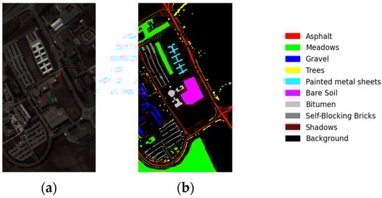 (a) False-color image of Pavia University and (b) the ground truth of Pavia University.