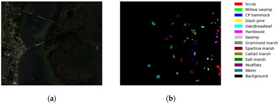 (a) False-color image of the Kennedy Space Center and (b) the ground truth of the Kennedy Space Center.