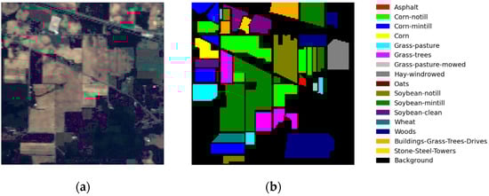 The IP dataset is a hyperspectral dataset acquired in northwest Indiana using the AVIRIS sensor. Figure 8 shows the IP dataset’s false-color image and ground-truth classification map. It comprises pixels, with a total of 200 bands available within the wavelength range of 0.4 um to 2.5 um spectral bands and a spatial resolution of 20 m, encompassing 16 distinct ground object categories.