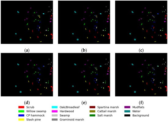 Classification maps for KSC dataset: (a) ground-truth map; (b) proposed method; (c) DBDA; (d) FDSSC; (e) SSRN; and (f) SVM.