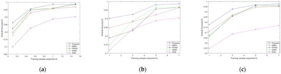 The overall accuracy (OA) results of various methods under different proportions of training samples: (a) PU, (b) KSC, and (c) IP.
