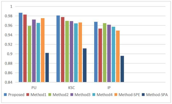 An ablation experiment was carried out to demonstrate each module’s efficacy in the proposed method. The model settings varied in the ablation experiments, including Method 1, which involved removing the stepwise superposition term from the residual block; Method 2, which entailed eliminating the multi-scale dilated convolution module and replacing the three branches with a uniform small-size convolution kernel; Method 3, which transformed the double-branch structure into a network structure that first extracted spectral features and then extracted spatial features; Method 4, which eliminated all skip connection parts in the network, including the direct mapping component in the multi-scale residual blocks and the direct mapping component of the overall data fusion; Method-SPE, which retained only the multi-scale spectral residual branch; and Method-SPA, which retained only multi-scale spatial residual branches. The experimental results of different methods on three datasets of PU, KSC, and IP are illustrated in Figure 13.