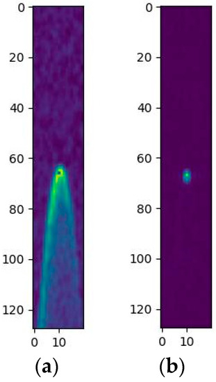 DDM data are produced by aggregating collected power distribution results and mapping the corresponding Doppler and time-delay coordinate positions. To create the DDM of sea surface scattering signals, the power distribution area in space is divided by equal time delay lines and equal Doppler frequency correlation lines. Points with the same time delay and Doppler frequency are then accumulated [19]. It is worth mentioning that an original TDS-1 DDM consists of 128 bins (with a resolution of 244 ns) in delay and 20 bins in Doppler (with a resolution of 500 Hz). Figure 1 shows the DDMs collected in seawater and sea ice, respectively.