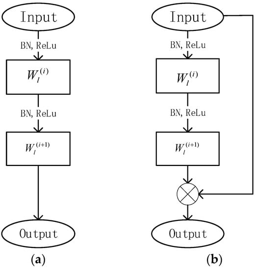 The ResNet is a typical nonlinear single-step iterative equation. As shown in Figure 3b, the input characteristic of the module is . The output of this layer can be described by: