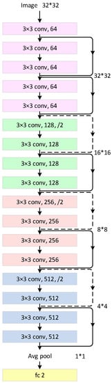 As pointed out in [23], ResNet effectively addresses challenges such as network degradation, gradient dispersion, and gradient explosion. Consequently, ResNet architecture was employed in this study (refer to Figure 4), designed with inputs of dimensions 32 × 32 × 3. The ResNet model comprises a ResNet block, a Global AvgPooling layer, and an output layer.