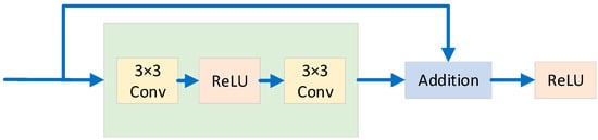 Taking the initial ResNet block as an illustration (depicted in Figure 5), the residual block consists of two 3 × 3 convolutional layers, yielding an equivalent number of output channels. Subsequently, each convolutional layer is immediately followed by a batch normalization layer and a ReLU activation function. These convolutional layers are then connected by bypass connections, adding the input directly before the final ReLU activation function. The initial block maintains the same number of channels as the input channels. Each subsequent block doubles the number of channels compared to the previous block while halving the height and width.