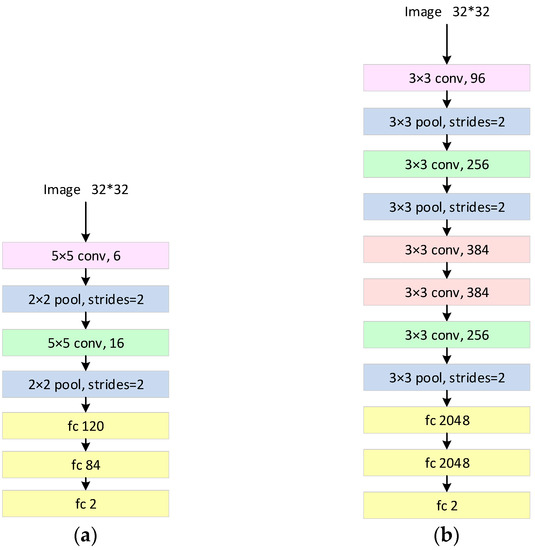 The structure of the AlexNet network is shown in Figure 6b. It contains 5 layers of convolutional layers, 3 layers of pooling layers, and 3 layers of fully connected layers. The network starts with a 32 × 32 input image, goes through convolution, pooling, and fully connected operations layer by layer, and finally outputs a prediction of the image category. The first convolutional layer consists of 96 convolutional kernels, each of size 3 × 3. After the first convolutional layer, followed by a maximum pooling layer, the pooling operation is performed using a 3 × 3 window with a step size of 2. The second convolutional layer consists of 256 convolutional layers of size 3 × 3, followed by a pooling layer. The third, fourth and fifth convolutional layers’ convolutional kernel size is still 3 × 3 and contains 384, 384, and 256 convolutional kernels respectively. Immediately after these convolutional layers are pooling layers. After the convolutional and pooling layers, AlexNet connects three fully connected layers. Both the first and second fully connected layers contain 2048 neurons, and the last fully connected layer outputs the score for the corresponding category.