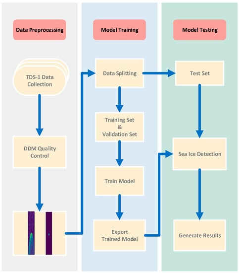 The sea ice detection algorithm process includes three steps: data processing, model training, and model testing. The flowchart of the sea ice detection algorithm is shown in Figure 7, and the specific steps are as follows: