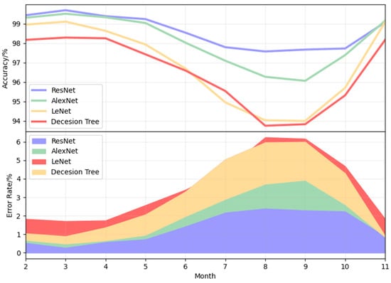 Figure 8 illustrates the detection performance of each algorithm for various months and presents a clear trend in sea ice detection accuracy. The accuracy of the four algorithms shows a downward trend from May to September. Among the four methods, the accuracy of LeNet, AlexNet, and Decision Tree declines significantly, while ResNet only hs a slight decline, and from July to September, it tends to be stable. Compared with the other three methods, ResNet has higher and more stable accuracy. The lower panel in Figure 8 shows the area plot of error rates for the four algorithms, which clearly shows that the Decision Tree has the highest error rate while ResNet has the lowest error rate, showing better stability during sea ice melt compared to the other algorithms.