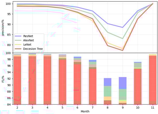 Figure 10 shows the line chart for precision and the F1-score histogram based on Table 2. Precision is concerned with the accuracy of the model predicting positive cases. A high precision rate means that the model predicts few false positives among the positive cases. Recall, on the other hand, focuses on the model’s ability to capture and correctly predict all instances of a positive class within a dataset. F1 scores combine precision and recall performance, and are more stable on unbalanced data sets because they take into account both the prediction accuracy and coverage of the model. ResNet has the highest precision and F1-score among all four algorithms from February to November, proving the algorithm’s superiority in terms of sea ice detection.