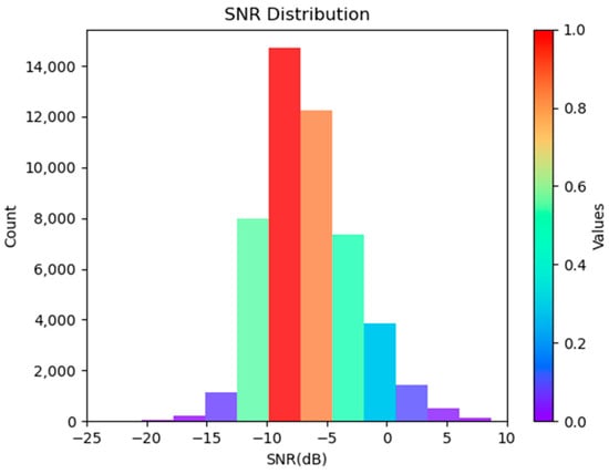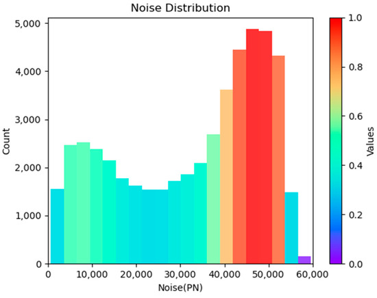 The noise and SNR of DDMs have a great impact on the accuracy of sea ice detection. The above results show that the sea ice detection accuracy for the whole year reaches its lowest point in September, so the DDM for September is selected for analysis. Figure 11 and Figure 12 show the distribution of noise and SNR for the September dataset. The range of noise is between 0 and 60,000 PN, with relatively more data in the range of 40,000–55,000 PN, which shows that the majority of the data is affected by noise. The range of SNR is between −25 and 10 dB, with a relative concentration of −10 to −5 dB.
