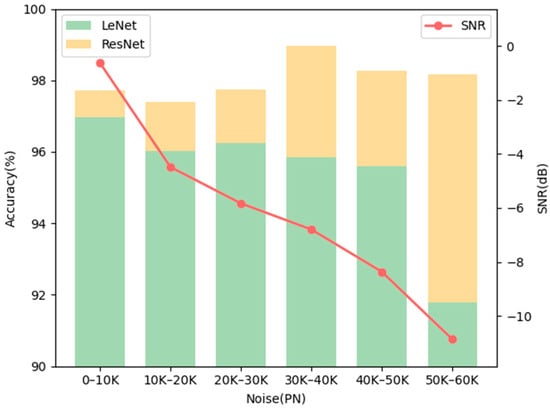 By comparing the performance of LeNet and ResNet in different noise segments for sea ice detection, it can be observed that when using LeNet for sea ice detection, the SNR decreases with increasing noise, and consequently, the accuracy of sea ice detection diminishes. It is worth noting that, at 50,000–60,000 PN, the sea ice detection accuracy exhibits a sharp decline. In contrast, the ResNet algorithm appears less sensitive to variations in noise and SNR, displaying stable performance.