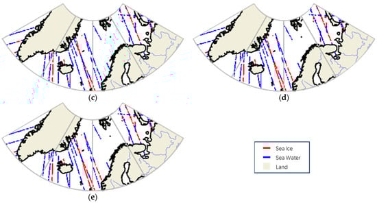 Results of sea ice detection using different methods on 25 September 2018: (a) AlexNet, (b) Decision Tree, (c) LeNet, (d) ResNet, and (e) ground truth.