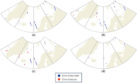 Errors of sea ice detection results using different methods on 25 September 2018: (a) AlexNet, (b) Decision Tree, (c) LeNet, and (d) ResNet.