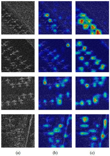 Grad-CAM [48] was used to visualize the network feature maps to effectively demonstrate the role of FLCAPN. As shown in Figure 11, the first column is the input test SAR image, the second column is the heatmap of FPN, and the third column is the heatmap of FLCAPN. All heatmaps were extracted from the features before being fed into the detector. It can be clearly observed that, compared with FPN, FLCAPN can extract the semantic information of aircraft targets more precisely and effectively, while ignoring the influence of clutter.