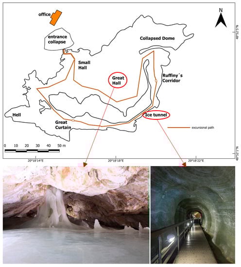 Dobšiná Ice Cave—ground plan of the glaciated part (top), and ice decoration in Great Hall (left) and artificial ice tunnel (right) (source: authors).