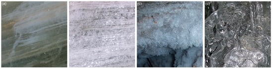 Different ice surfaces in the cave (source: authors). (a) smooth, compact ice with deposits in layers; (b) smooth, clear ice with a densely cracked surface; (c) frost formed from crystals of a few mm to cm in size; (d) smooth and transparent ice formed from freshly accreted water.