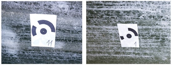 For the later comparison and analysis of results, the project was georeferenced bundle adjustment with ground control points (GCP) and checkpoints (ChP) in the form of 12-bit coded targets of A4 size paper. There was no possibility of using any standard geodetic monumentation of these targets. Therefore, we decided to place them directly on the ice surface by light melting of the surface by hand movement and then firmly placing the paper onto the ice (Figure 5). After a short while, the melted ice freezes again, fastening the paper on the surface.