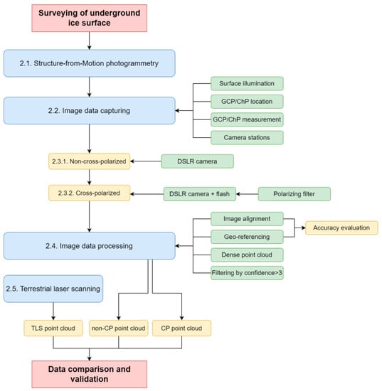 The whole glaciated part of the cave, also available to tourists, was surveyed by terrestrial laser scanning (TLS). TLS was realized by a pulse laser scanner Leica ScanStation C10, with Leica HDS targets for scan registration. With the spatial resolution of 30 × 30 mm in the final point cloud, more than 85 million points were recorded. The scanning was conducted from 30 survey stations, with the accuracy of a single measurement in the position of 6 mm and in a distance of 4 mm. The ice tunnel was covered by scanning from 3 scanning stations. Registration of individual scans was conducted directly in the scanner during the scanning using the Leica HDS targets. A correct georeferencing of the scanning was ensured by total station surveying of HDS targets connecting it to the geodetic control monumented in the cave. The final workflow of the overall surveying works is given in Figure 6.