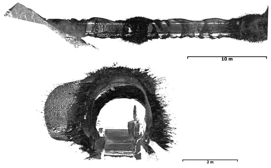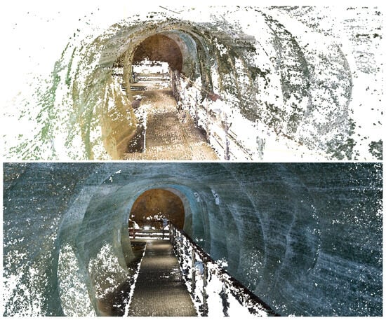 Dobšiná Ice Cave is a typical example where TLS was used to obtain an overall model of the cave, and digital photogrammetry was used for a more detailed modelling of selected sites for the purpose of the long-term monitoring of ice-filling dynamics [,]. However, in some parts of the cave, these technologies also failed, and their results were not applicable (Figure 7), especially in the tunnel cut in the ice filling. As can be seen in Figure 9, Figure 10 and Figure 11, individual results imply the following. The laser scanning beam penetrates well below the ice surface, in some places up to 70 cm (Figure 11). On the other hand, using conventional SfM photogrammetry, although the resulting point cloud is free of such outliers (Figure 11), the significant reflections of artificial illumination from the ice made the point cloud very sparse with many empty spots and near-surface noise (Figure 9).