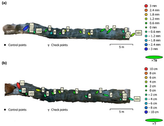 Error estimates of GCPs from CP (a) and non-CP (b) photogrammetry in Agisoft MetaShape software—a side view of the tunnel. Z error is represented by ellipse colour, and X,Y errors by ellipse shape.