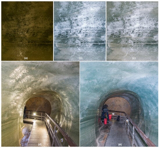 For these reasons, we proposed using cross-polarized photogrammetry, by which we could filter out unwanted reflections and thus obtain a compact, dense point cloud covering the shape of the tunnel without significant noise. The following Figure 11 shows detailed images with various ice surface textures and reflections, depending on the method of illumination. It can be clearly seen that when using only artificial illumination in the cave (a), images are very sensitive to proper exposure, the texture of the ice is fading away, and the ice creates reflections. On the other hand, when using the mounted camera flash with no polarization (b), the texture and exposure are better; however, reflections are still present. Finally, by using flash with cross polarization (c), we can obtain a clear, sharp texture of the ice with no reflections from other light sources.