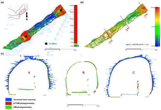 When comparing the resulting point clouds from TLS, CP SfM and non-CP SfM using three vertical cross sections (Figure 11c; A—through a scanning station, B—between scanning stations, C—through a scanning station), the differences using these technologies are clearly visible. Although the TLS point cloud covers the entire surface of the tunnel without significant holes, the penetration of the beam through the ice makes such a cloud unusable. Although the cloud from non-CP photogrammetry is not as noisy, most of the surface is without any points, making such a cloud unusable as well. Only the cloud from CP photogrammetry covers the entire surface of the tunnel densely enough without additional noise.