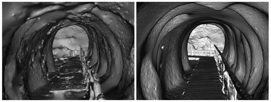 A perspective view through the mesh model of the ice tunnel; (left)—non-CP photogrammetry, (right)—CP photogrammetry.