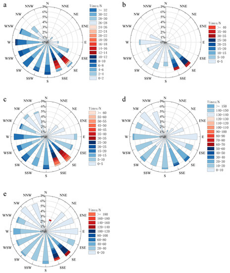Distributions of wind directions in different seasons. In which, (a) is wind direction rose chart of Spring, (b) is wind direction rose chart of Summer, (c) is wind direction rose chart of Autumn, (d) is wind direction rose chart of Winter, and (e) is wind direction rose chart of the whole year.