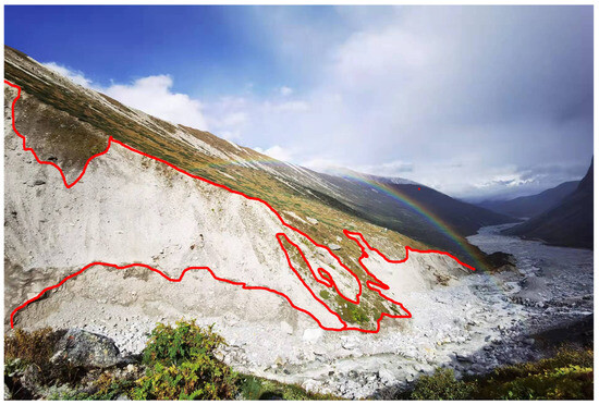 Due to the steep slope at the first step of the glacier, if large amounts of ice fall, they will directly gush into the ice lake and cause surges, which may cause the spillway to burst. The spillway has a height difference of about 40 m with the river and is nearly perpendicular to the other side of the river bank. When a surge instantly rushes into the river and hits the slope of the opposite bank, this part of the bank with loose soil may experience landslides or collapses (Figure 4), causing slope instability and providing large amounts of material sources for debris flow. That is to say, the form of the disaster chain is ice avalanche–ice lake collapse–debris flow. The debris flow formed by the collapse of the ice lake is sudden, which is often accompanied by erosion on both sides of the channel, resulting in the collapse of soil on both sides of the channel, the destruction of vegetation, and the flooding of pastures in areas with flat terrain, causing damage to the ecological environment and posing a threat to the lives and property of local residents. According to the literature records, in May and June 2002, there were two ice avalanches into the Jialongcuo lake, which led to collapses of the ice lake and debris flow disasters.