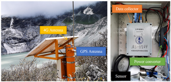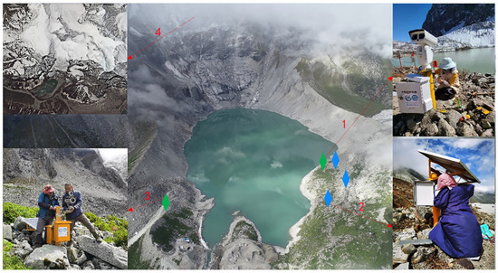 As shown in Figure 5, the blue marks are the positions of infrasound monitoring equipment (corresponding to 2 in the figure). Three sets of infrasound monitoring equipment are installed to form an infrasound array, and the sensors are all facing the glacier (corresponding to 4 in the figure) in the rear edge of Jialongcuo. The infrasound array can effectively reduce the interference of background noise and improve the signal-to-noise ratio of the signals. The green marks are the position where the cameras are; the camera on the right side of the lake (corresponding to 1 in the figure) is used to cooperate with infrasound monitoring equipment to monitor the glacier dynamics, and the camera on the left side of the lake (corresponding to 3 in the figure) is used to monitor whether there are surges and bursts at the overflow mouth of the ice lake.