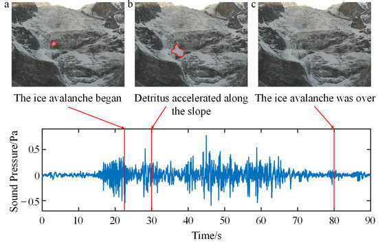 An ice avalanche on 24 November 2021. The ice avalanche occurred at 17:15:20 from the video, and the time range for intercepting the infrasound signal is 17:15:00~17:16:30, in which (a) corresponds to 17:15:23, (b) corresponds to 17:15:30, and (c) corresponds to 17:16:20.