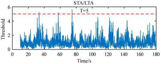 The time–window ratio method sets a long-time window and a short-time window, the windows move with the time series, and all signal amplitudes in the long-time window and short-time window are averaged at the same time. When the ratio R of the two windows exceeds the set threshold T, it is confirmed an event happened [26,27].